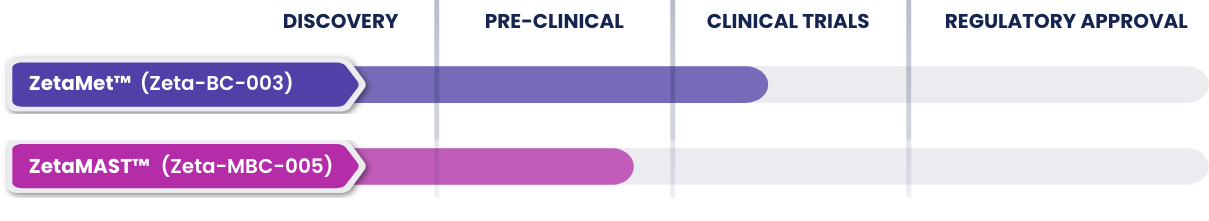 ZetaMAST™ (Zeta-MBC-005) is a proprietary novel drug being designed for patients with unresectable, multifocal breast cancer metastases to the liver. ZetaMAST™ (Zeta-MBC-005) can be administered as a percutaneous injection utilizing a proprietary hydrogel carrier containing a precise, tailored concentration of our small molecule. Preclinical studies have demonstrated ZetaMAST™ (Zeta-MBC-005) may cease lesion growth, with the goal of enabling improved quality of life as part of a cancer treatment program, including longevity.